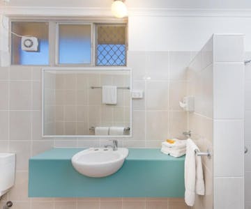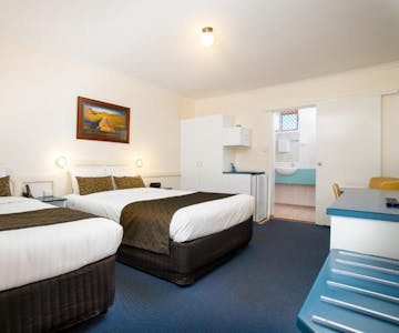 This ground floor, air-conditioned room features TV, a seating area, fridge, microwave and tea and coffee making facilities. It has a desk, ironing facilities and a bathroom with a shower and 1 x Queen bed , 2 x Single beds